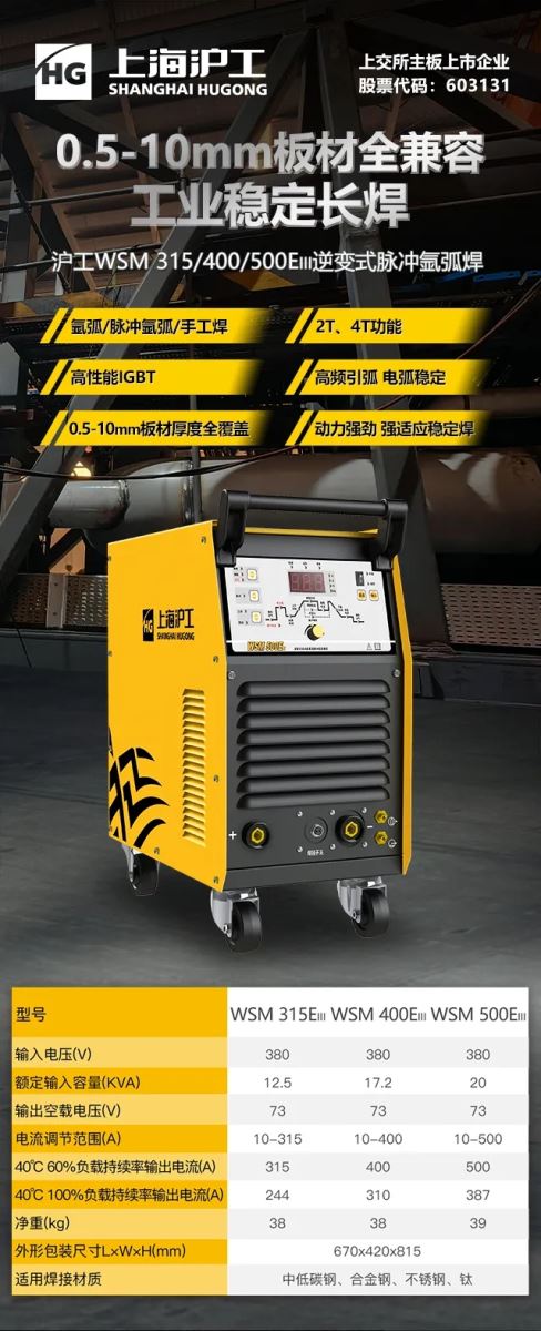 【沪工焊机】WSM315/400/500EIII逆变式氩弧焊机,0.5-10mm板材全兼容,工业长焊稳定之选!